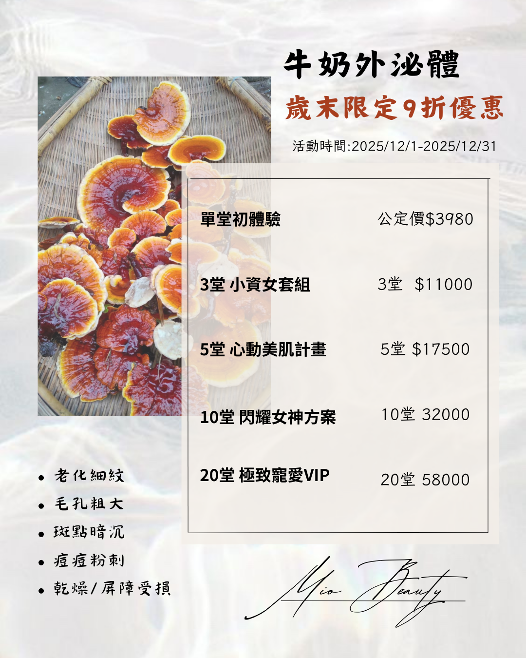Mio皮膚美學主打[用保養的方式達到讓肌膚健康的效果],針對客製一對一保養的方式,採一膚易保養,讓每種不一樣的肌膚都能達到完善的照顧和改善。不只肌膚管理,耳朵 眼睛 spa 除毛都有服務到,讓你進到Mio從頭美到尾。